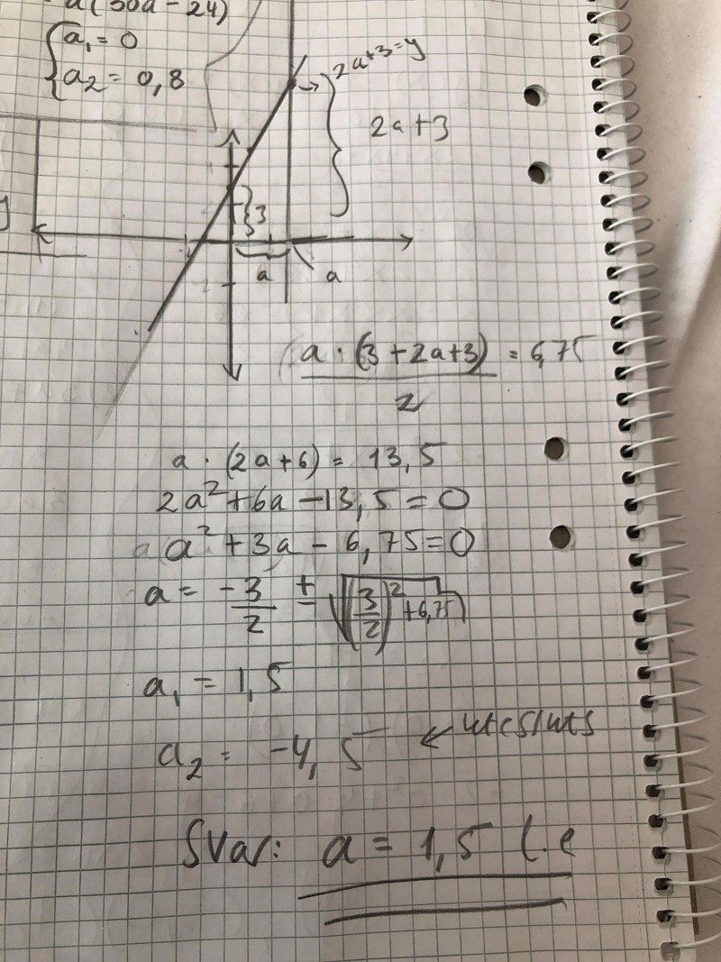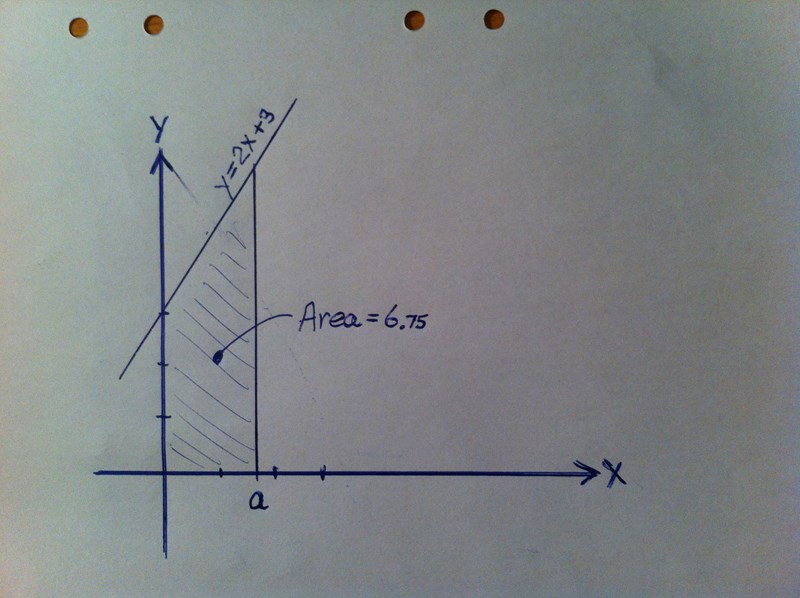 De räta linjerna y=2x+3 och x=a (a>0) bildar tillsammans med de positiva koordinataxlarna en area som är 6.75 areaenheter. Bestäm a