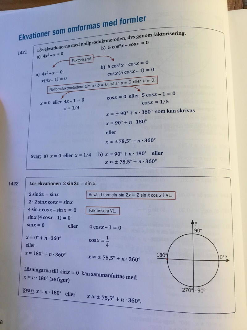 1421b: 90o kommer från nollproduktmetoden. Antingen är cos(x) = 0, eller så är 5 cos(x)-1 = 0. Det första fallet ger att x = 90o+n.360o.