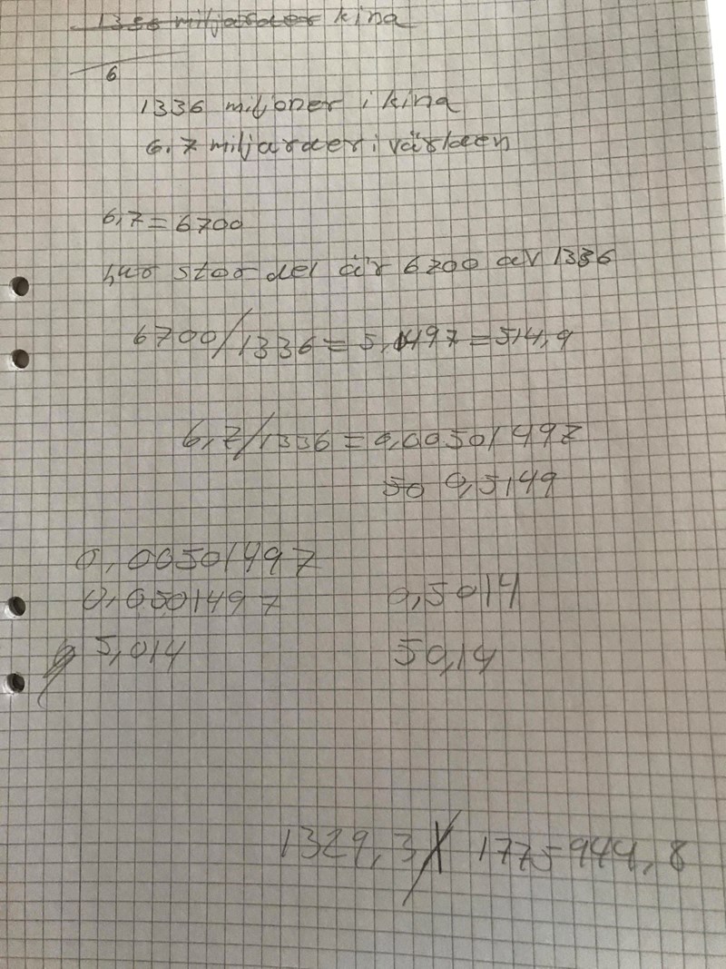 Man frågar efter hur stor del Kinas befolkning är av hela jordens befolkning. Du skall alltså beräkna . Problemet är att jordens befolkning är angiven i enheten miljarder och Kina s befolkning i enheten miljoner. Det enklaste är att du räknar om jordens befolkning till miljoner innan du utför divisionen.