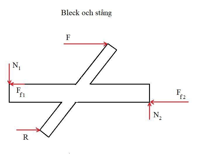 Den enda friktionskraften som uppstår är alltså mellan bleck och stång. Spåran tar endast upp vertikala krafter då blecket försöker rotera stången. Men hävarmen från friktionskrafterna blir ju detsamma även om de suttit vid bleckets kontaktyta mot stången så du har ändå rätt. Tacksam för ett sista svar :D