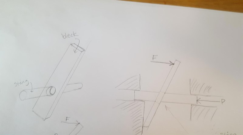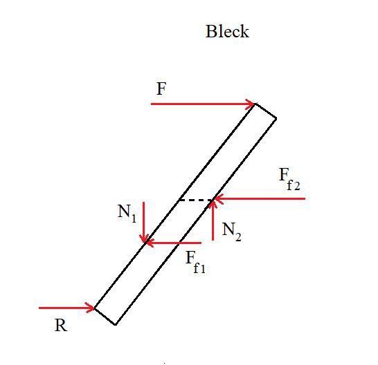 Jag tror vi ser problemet på olika sätt pga att jag gjort det otydligt från början. Jag menar på att kraften P(2700N) verkar på stången horisontellt och mellan det snedställda blecket(som klämmer fast stången) och stången uppstår friktion (elastomer pga max friktionskoefficient då det är ett extremfall). Kraften kommer då att sprida sig i spåran samt mot bleckets nedre kant, och frågan är, hur stor kraft måste verka på bleckets övre del för att generera tillräcklig friktion mellan bleck och stång för att systemet ska vara fixerat?