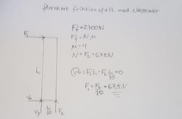 Jag har gjort en förenklad uträkning där jag endast vill ta reda på om kraften F kan generera en kraft på stången som därmed blir Normalkraften som friktionskraften är beroende av. Målet med uträkningen är att visa ett extremfall där kraften F är för stor för sitt ändamål.