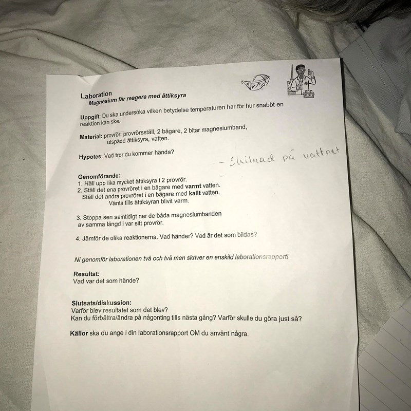 Vad gick du ut för att undersöka? Ifall reaktioner sker olika snabbt vid olika temperaturer? Ifall magnesium är en oädel metall? Ifall vätgas bildas vid reaktionen? Du får olika rapporter beroende på vad du skulle undersöka
