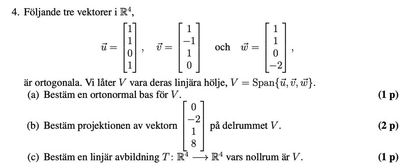 Det visar sig att vektorn i uppgift b) ligger i delrummet V och att projektion u = u.