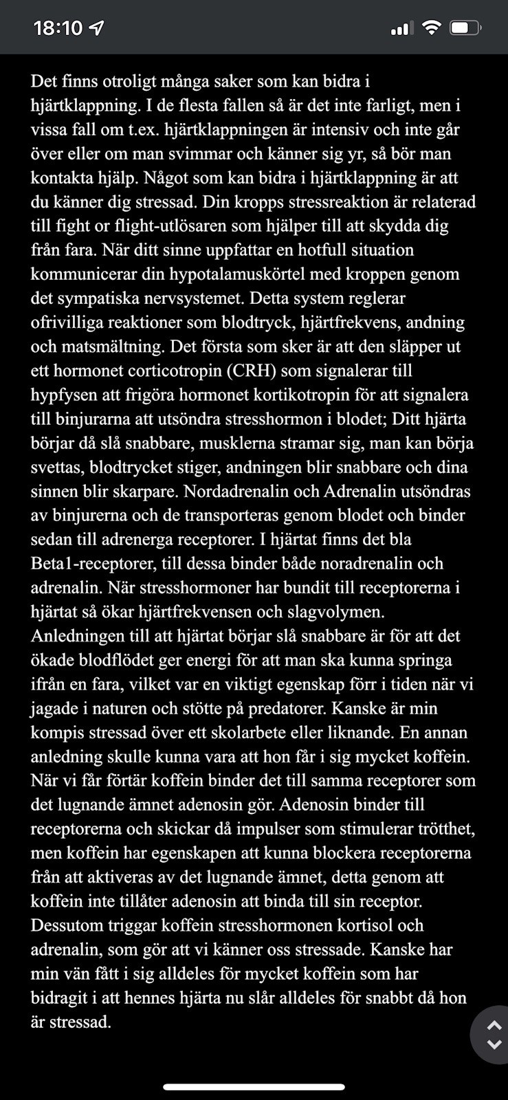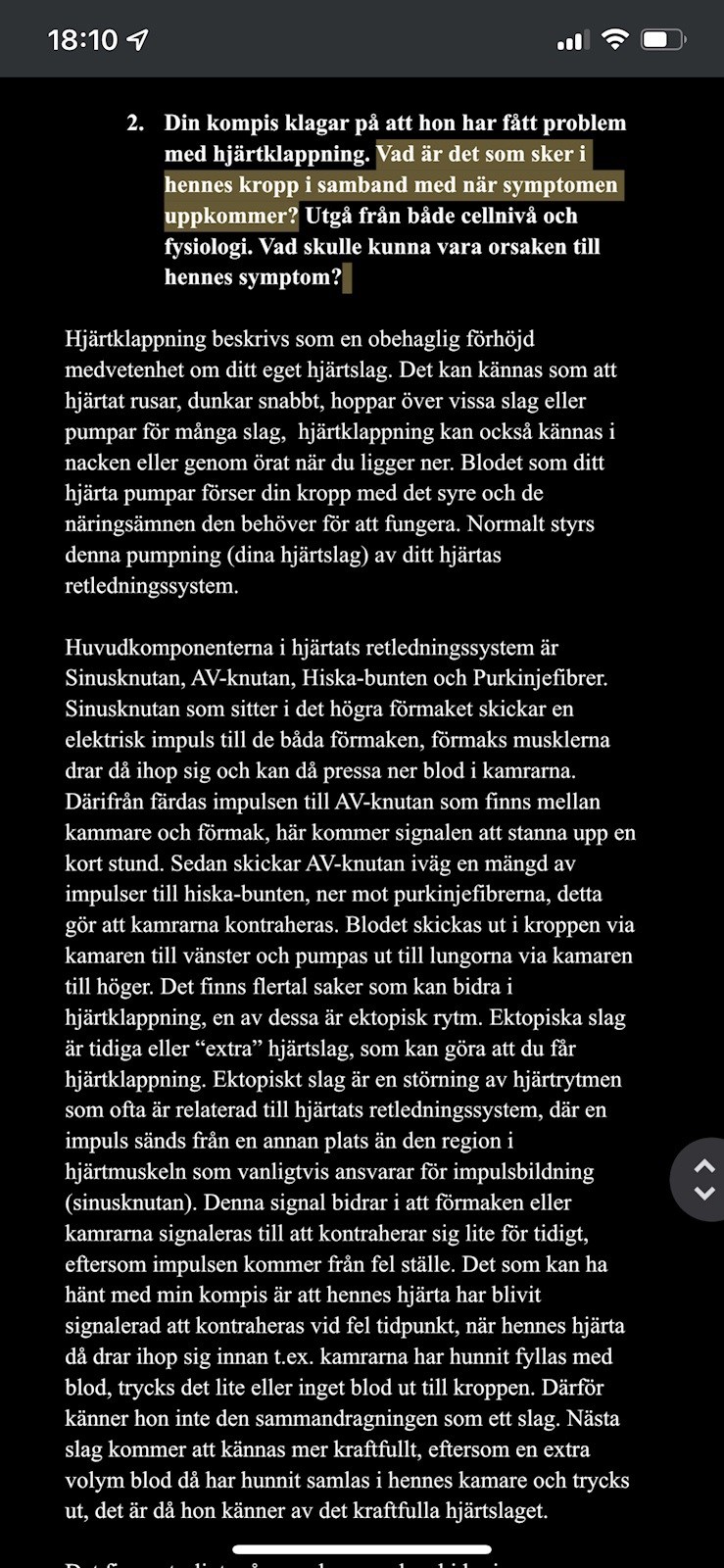 Hej! Jag försöker besvara denna frågan. Har gjort lite punkter som jag tänker kan vara intressanta att resonera utifrån. Men strugglar lite med delen om "vad är det som händer i hennes kropp i samband med att symptomen förekommer". Måste skriva denna delen väldigt detaljerad eftersom jag satsar på högsta betyg, men jag hittar väldigt få källor på vad som händer i hjärtat under hjärtklappning. Har hittat detta online: