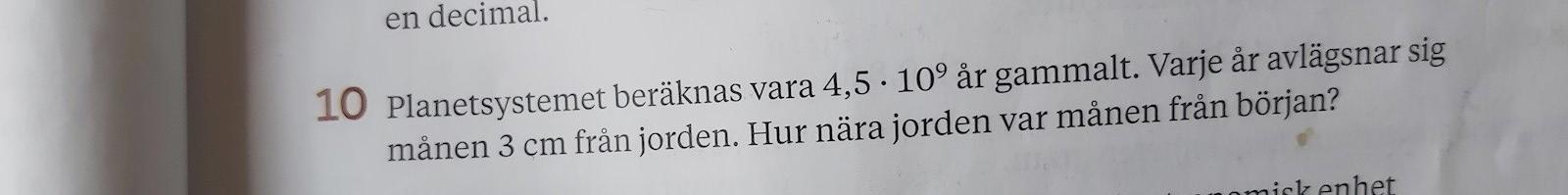 planetsystemet beräknas vara 4,5x10^9 år gammalt varje år avlägsnar sig månen 3 cm från jorden hur nära jorden var månen från början?