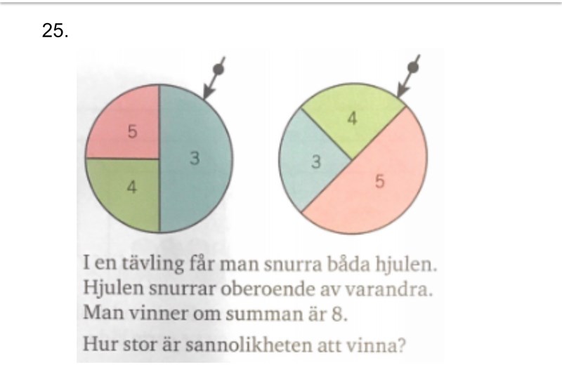 hur ska man tänka när det gäller dessa uppgifter? Det som förvirrar mig är att det är olika sannolikhet för att få 3 och 5 då de tar upp hälften av hjulet. Uppskattar hjälp :)