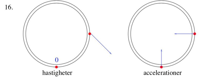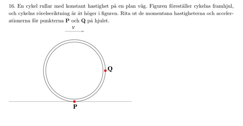 Mitt resonemang angående hastigheterna: Eftersom cykeln rör sig åt höger borde hastigheten på hjulet i vissa lägen vara åt höger. Jag testade att snurra en burk som ligger ner åt höger 1/4 varv och såg att punkten som motsvarar punkten Q hamnade längre åt höger och nedåt när jag snurrade på burken. Punkten P hamande högre upp men förflyttades inte åt höger eller vänster. Då resonerar jag (efter jag har sett facit) att accelerationen är det i punkten P är det som får punkten att röra sig uppåt när jag rullar den 1/4 varv. Det här kan vara rätt svårt att inse, särskilt ifall man inte har tillgång till något man kan rulla under provet. Är det någon som vet något annat sätt att lösa uppgiften på, och har jag resonerat rätt?