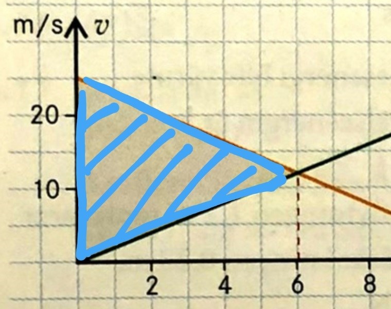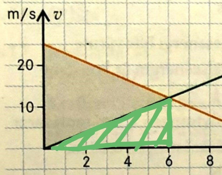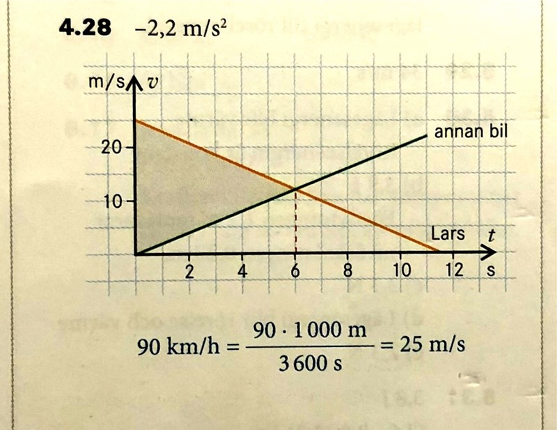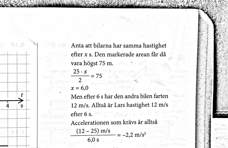 Och 75 meter är avståndet från Lars vid tiden 0 till bilen framför. Sedan accelererar bilen vilket gör att avståndet minskar men inte lika snabbt som om bilen skulle stått still. Arean får vara högst 75 eftersom arean under en vt-graf motsvarar lägesförändringen och den får inte vara mer än 75 m för annars krockar de