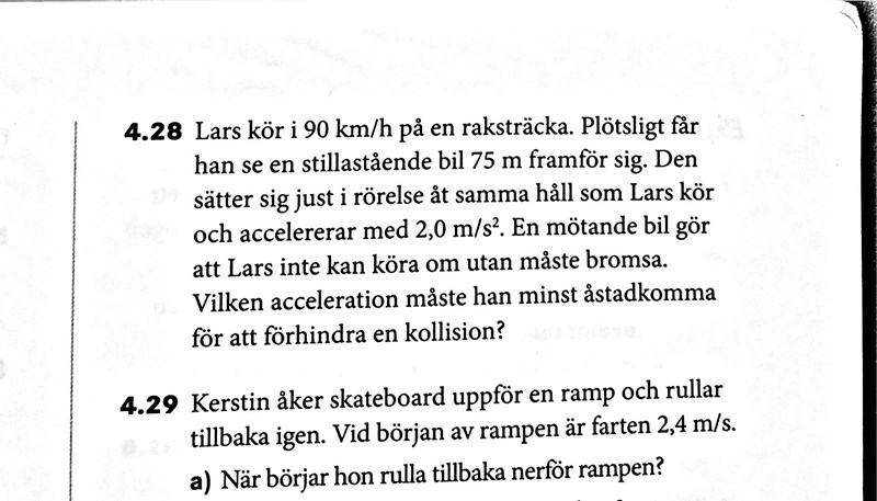 För att om de inte har samma hastighet kommer Lars köra in i bilen. Och eftersom de frågar efter den minsta accelerationen ska vi bromsa precis så mycket så vi inte kör in i bilen framför.