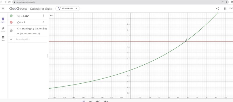 Ett alternativ är att man lär sig använda ett program som ex. Geogebra där man skriver in en funktion f(x) som är 1,012^x och låter en annan funktion g(x) vara 2 och ser var dessa möts alltså där 1,012^x är lika med 2.