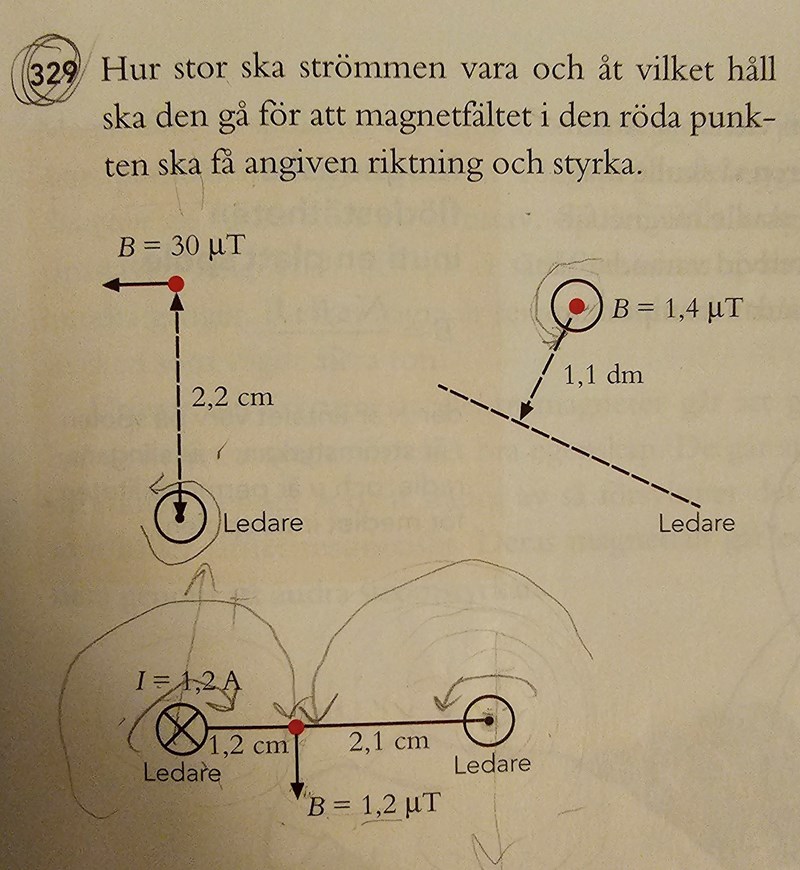 Men svaret blir det negativt. Är det fel på boken? Ledaren till höger är en punkt i en cirkel och det betyder att den är riktad ut ur pappret vilket ger en magnetfält som är riktad nedåt. Jag vet redan att om ledarna har samma strömriktning motverkar de varandra och om de har motsatt riktning förstärker de varandra.