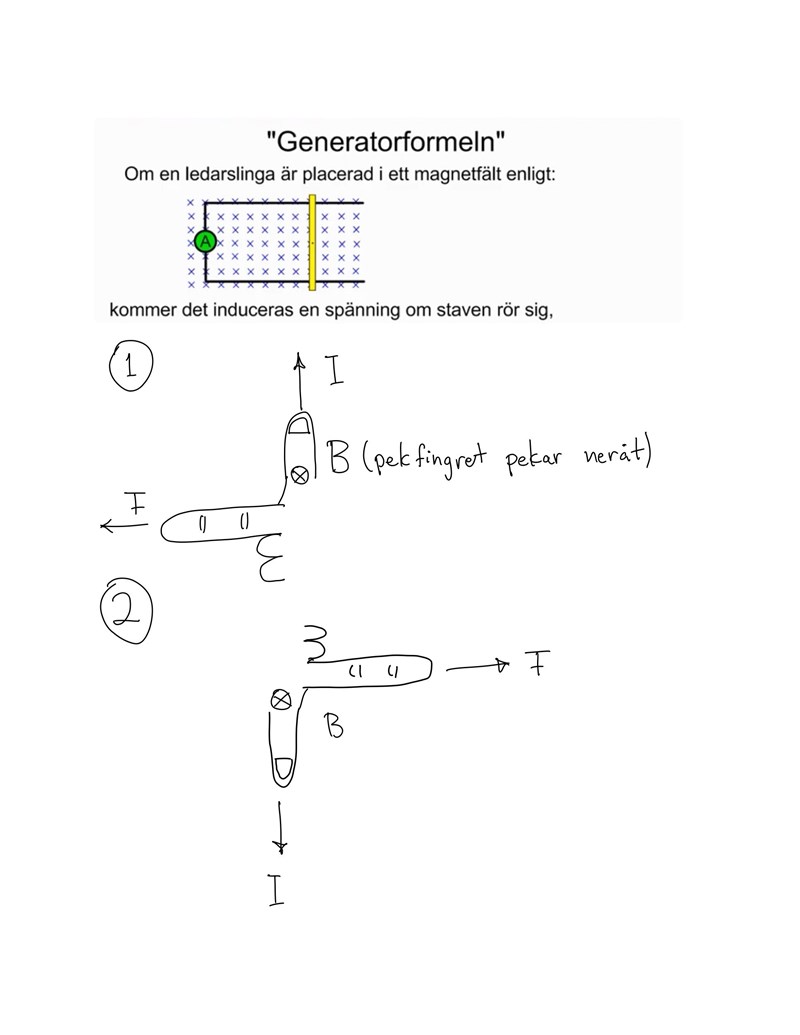 Handflatan åt höger och pekfingret in i pappret .... då bli tummen nedåt.Om t.ex staven rör sig åt höger kommer kraften bildas åt vänster, nu vill vi veta hur strömmen går.