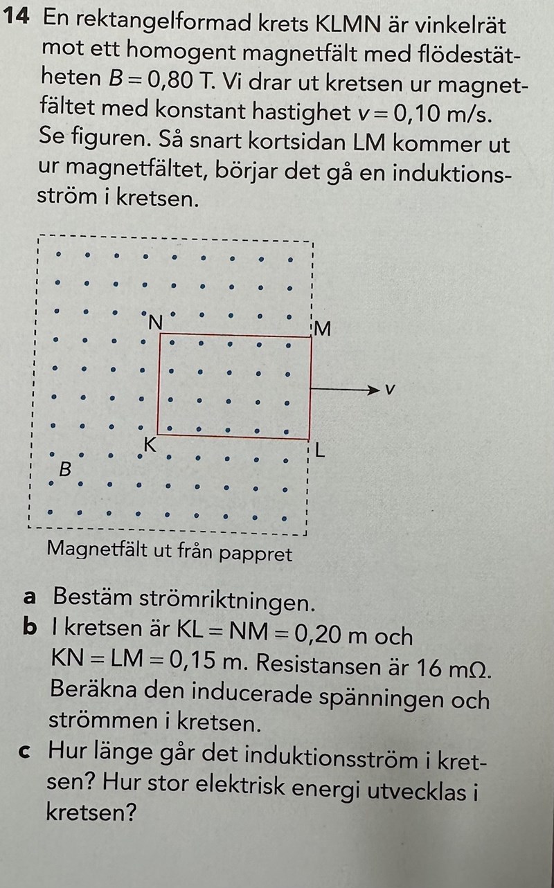 En inducerad elektrisk ström motverkar ju sin orsak. Så tänker att eftersom figuren rör sig till höger ut från magnetfältet, borde den inducerade strömriktningen röra sig mot vänster (moturs), dvs att strömmen går från N-K-L-M-N.