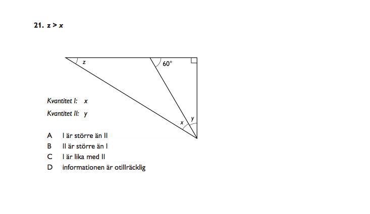 Jo, man kommer vidare? y måste vara trettio grader, eftersom de andra vinklarna är sextio respektive nittio grader. Vi kan kalla komplementvinkeln till 60 grader för A. A måste vara 120 grader (om det är en rät linje, men det är det nästan garanterat), och då finns det sextio grader kvar, alltså att z+x=60°z+x=60^{\circ}. Eftersom z>xz>x måste x vara mindre än trettio grader, därav är y större än x. Eller tänker jag lattjo någonstans?