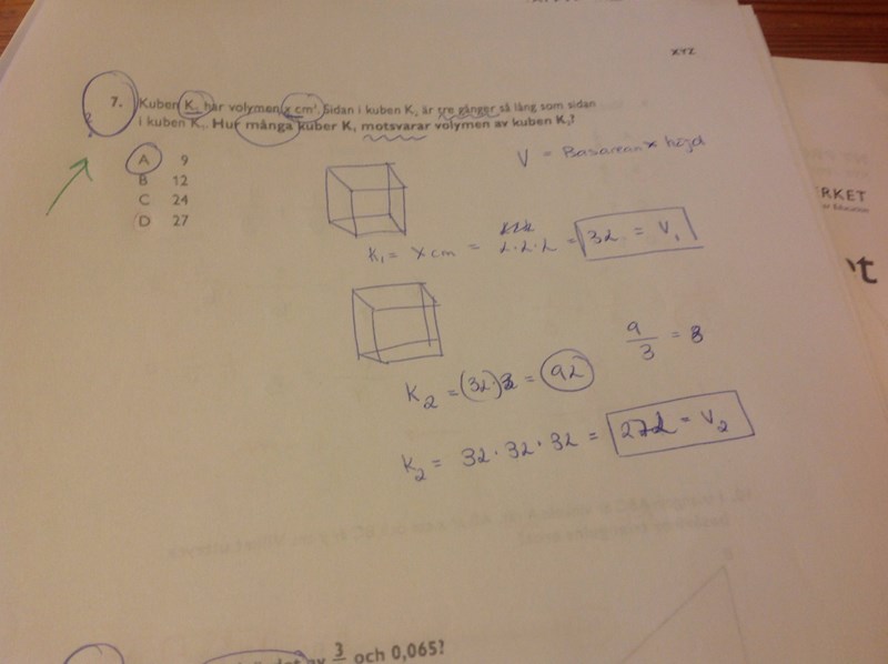 Har svårt med detta tal. I min uträkning som ni ser nedan så är ena kuben 9 gånger så större än den andra kuben eftersom 9*3 är 27. Men enligt facit är svaret D. Varför då?