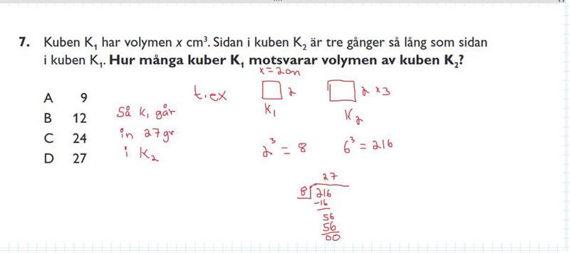 Jag kvantifierar också och får att kuben K1 har volymen och kuben K2 har volymen som är lika med eftersom enligt min kvantifiering är . Det får tydligen plats stycken K1 inuti K2; rätt svar ska nog vara D.
