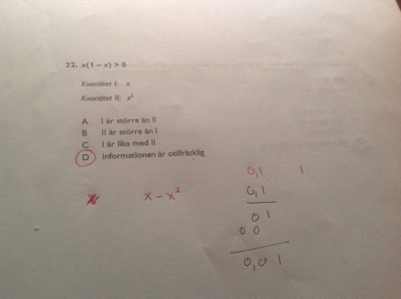 Men det är inte det de frågar efter. De frågar: OM x(1-x) > 0 vad gäller då.