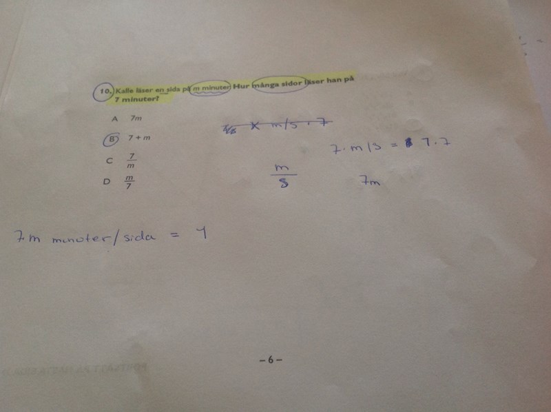 Jo, på 7 minuter hinner han 7/2=3,5 sidor. Då ser du att rätt svar är 7/m.