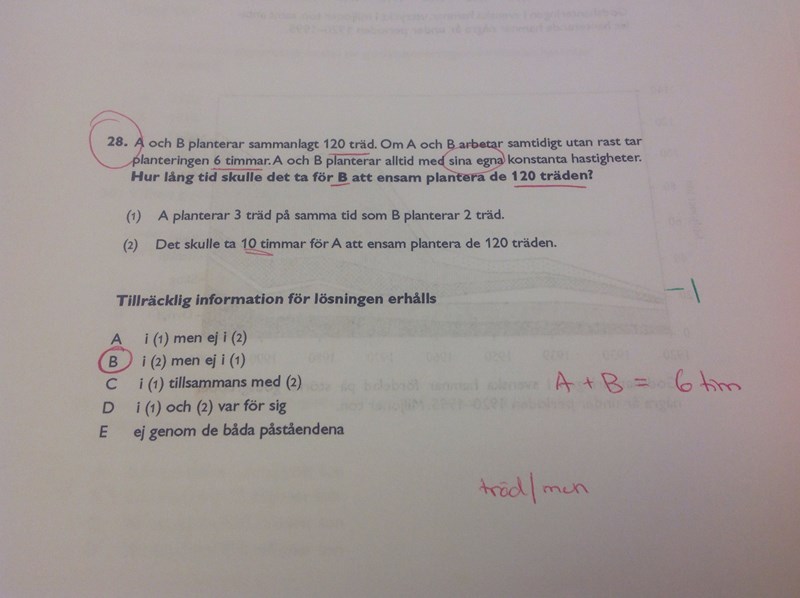 Jo, jag förstår att man i uppgiften inte behöver lösa själva uppgiften. Utan att frågan igentligen  är "hur mycket mer information behöver du för att kunna lösa den" . Just i denna uppgift är frågan "hur mycket information behöver du för att få reda på hur lång tid det tar för B att plantera träd själv" då gäller detta hastighet, eller?