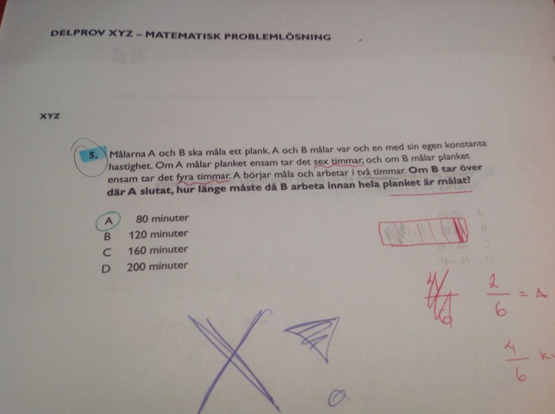 A målar på 6 timmar färdigt och B målar på fyra timmar färdigt. Jag delar 6/4 för och veta hur mycket snabbare B målar. Och det är 1,5. Jag vet at det är 4 timmar kvar för A och måla, jag vill veta vad det motsvarar för B. Därmed 4/x :1,5 och så löser man ut x som ska motsvara detta.