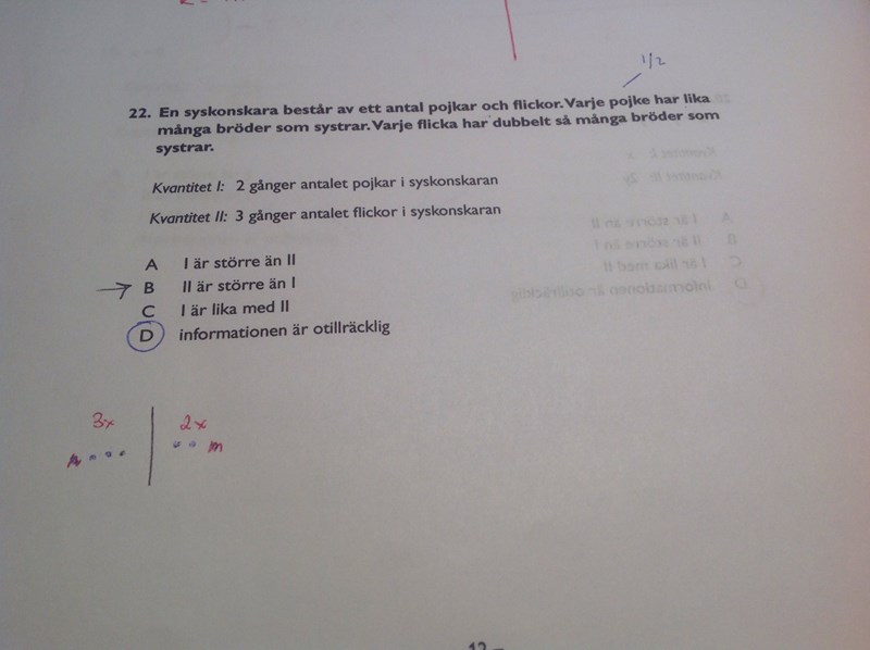 Tycker att i denna uppgift svaret borde vara att "informationen är otillräcklig". För att om det är 3 pojkar och 2 flickor så blir kvantitativ 1 samma som 2. Men om det är 4 pojkar och 3 flickor så blir kvantitativ 2 större än 1. Men enligt facit så är svaret B. Undrar varför?