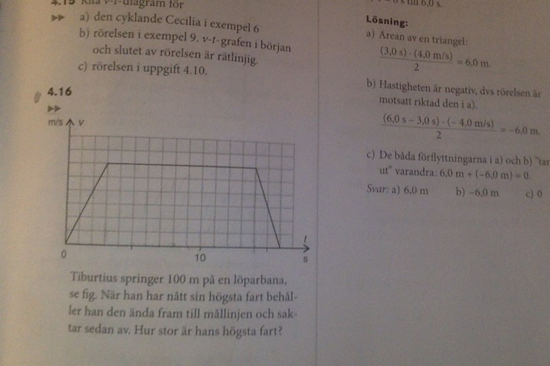 Nej, det är inte medelhastigheten man frågar efter den här gången. Du skall räkna ut v så att arean från t = 0 till t = 14 (han bromsar ju inte förrän han har kommit i mål) blir 100 m. Först accelererar han från 0 till v på 3 sekunder, och sedan håller han samma höga fart ända in i mål.
