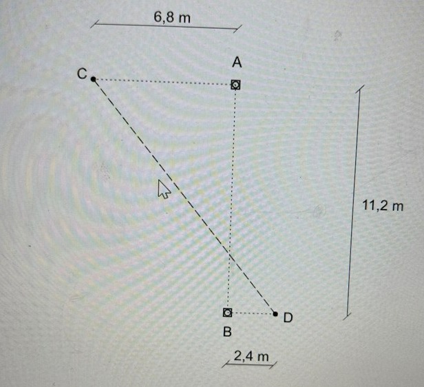 BC är hypotenusan i en rätvinklig triangel där kateterna är AC (6,8m) och AB (11,2m).