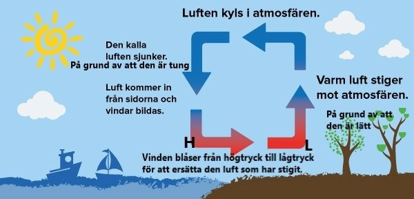 En solig och varm dag kommer luften värmas upp. Eftersom varm luft har lägre densitet än kall luft (pga partiklarnas rörelse) kommer denna stiga. Platsen där den varma luften stigit ifrån får nu ett LÅGTRYCK detta eftersom det är betydligt tommare där när alla luftpartiklar stigit.