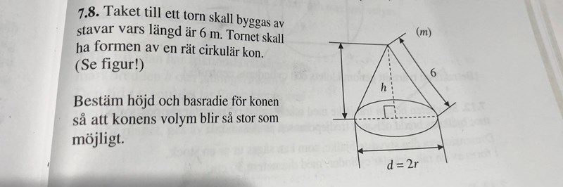 Lös ut r istället - då slipper du så småningom den där krångliga roten, eftersom man kvadrerar radien när man beräknar volymen för konen. (Jag kanske borde ha skrivit detta lite tidigare, så att du inte hade löst ut h i onödan, men jag tänkte inte på det då...)