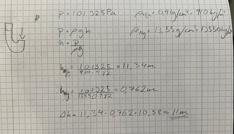 Hur mycket högre blir en barometer om man fyller den med olja av densiteten 910g/cm3  i stället för kvicksilver?