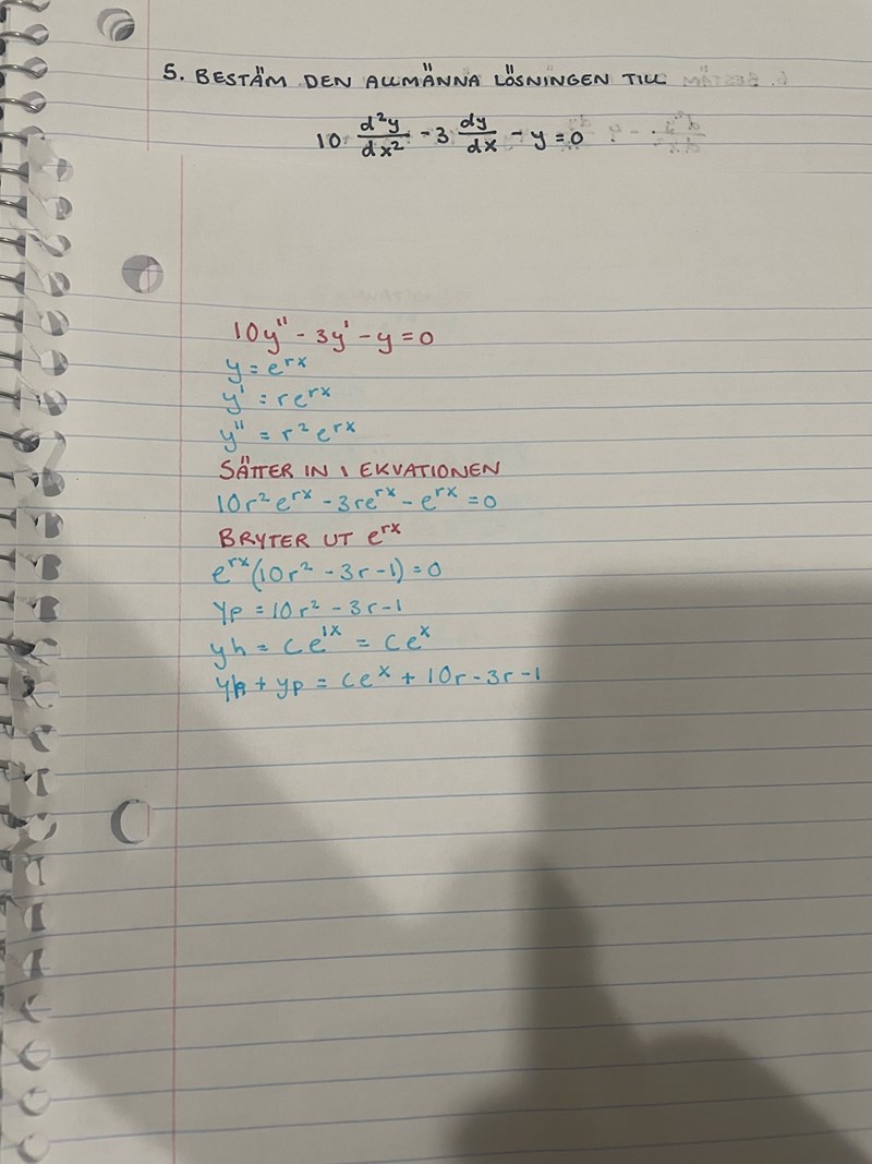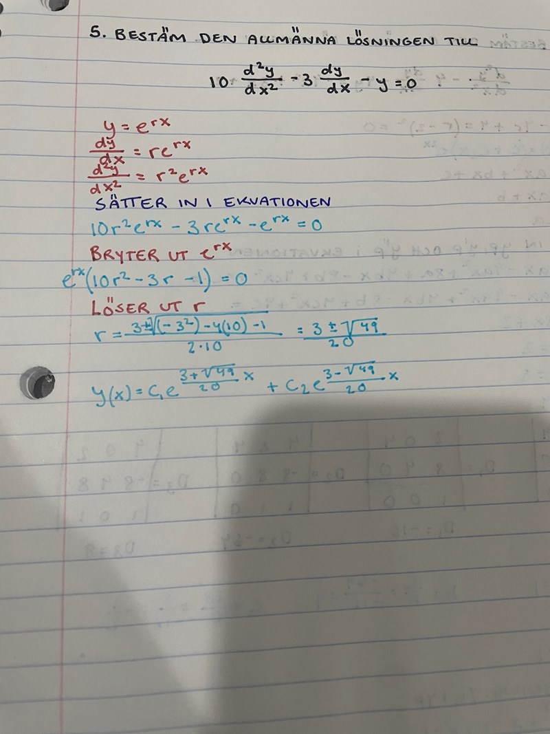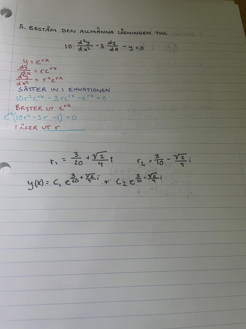 Jahaa då fattar jag, alltså y = C1e^(1/2) + C2e^(-1/5) ska vara y = C1e^(X/2) + C2e^(-x/5) och det är svaret?