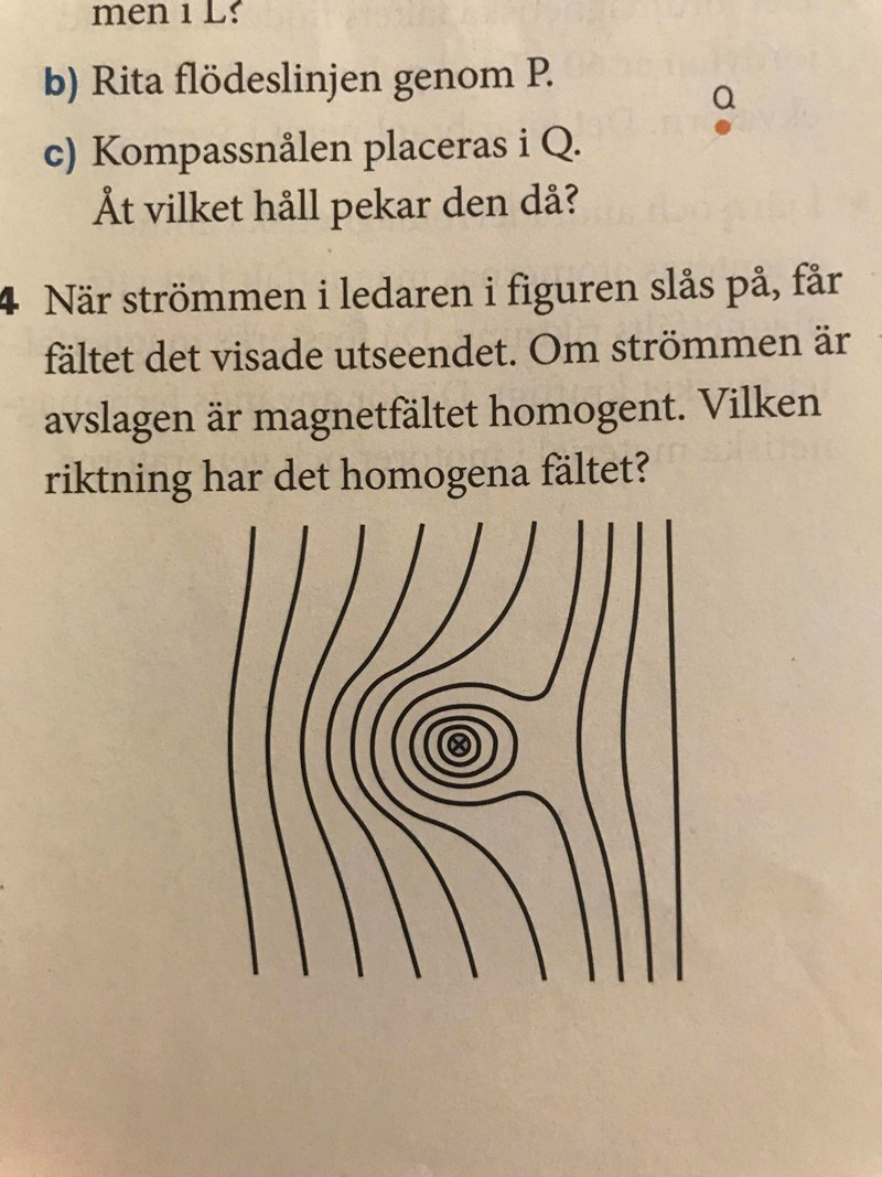Har lite problem med frågan ovan. Hur ska jag tänka? Jag förstår att det fält som skapas runt ledaren består av flödeslinjer som roterar medurs, eftersom strömmen går "in i papperet". Det skulle då ge upphov till en kraft, till höger om ledaren riktad och vänster och vice versa. Men hur vet jag åt vilket håll det homogena fältet går? Kan jag tänka att det går uppåt för att flödeslinjerna då tar ut varandra, eller iaf motverkar varandra, till höger om ledaren och därför ger upphov till en mindre kraft riktad mot ledaren än vad de till vänster får, eftersom flödeslinjerna där förstärker varandra. Och att det är därför linjerna blir tätare till vänster, av den större kraften riktad mot ledaren, än till höger?
