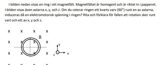 Madzer skrev:Det kanske är jag som har missförstått frågan lite lätt, men ska jag tolka frågan som att man frågar efter spänningen som induceras under rotation och inte som jag tänkt mig när rotationen är "färdig"? Isåfall bör induktion ske vid rotation kring y- och x-axeln som Smaragdalena säger för det är endast då antalet flödeslinjer skiftar över ytan under rotation. Tänker jag rätt då?