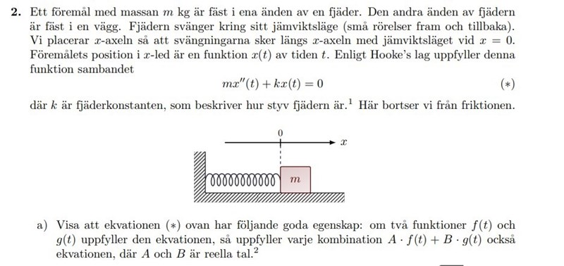Hej, Jag sitter med a) uppgiften och förstår inte vad man ska visa. Hur uppfyller f(t) och g(t) ekvationen och vad innebär kombination?