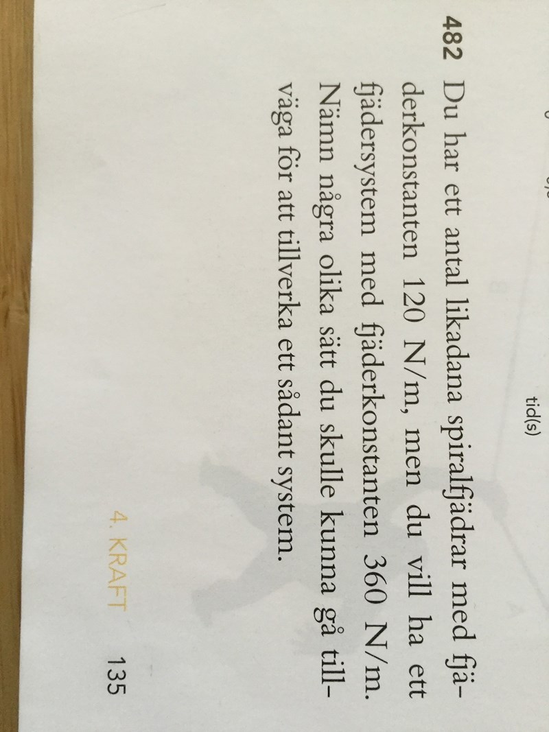 Hej! Jag vet inte hur jag ska lösa denna mer än att jag kan sätta ihop fjädrar för att få en ny fjäderkonstant. Jag förstår inte heller det andra inlägget i pluggakuten där samma fråga tagits upp. Tacksam för svar.