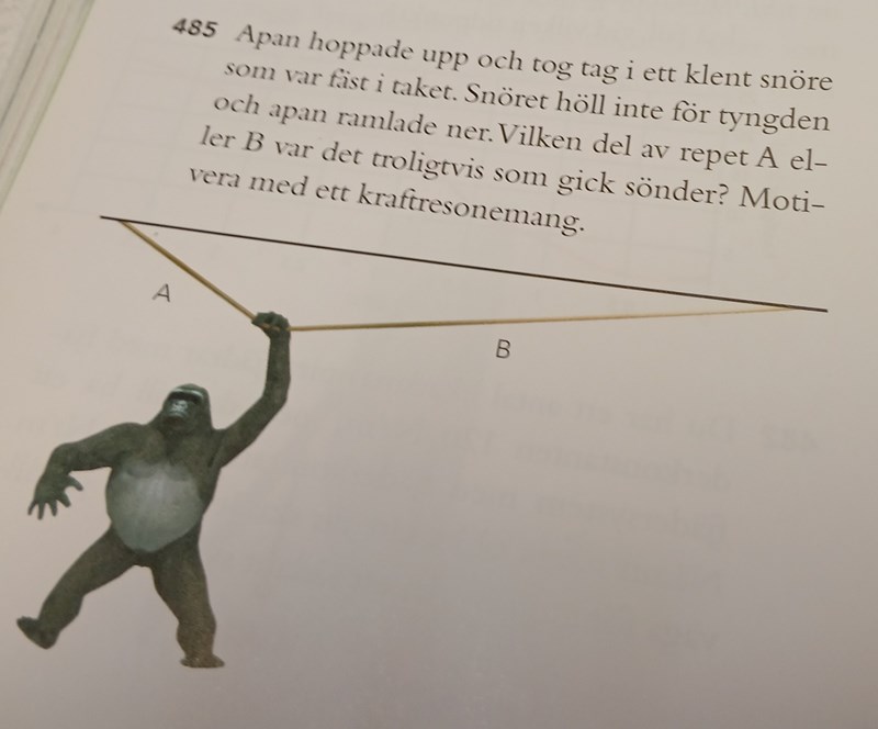 Rita ut de krafter som verkar på apan i bilden, alltså innan den börjar falla för att snöret går sönder. För enkelhets skull kan du ju rita att tyngdkraften mg utgår ifrån apans hand.