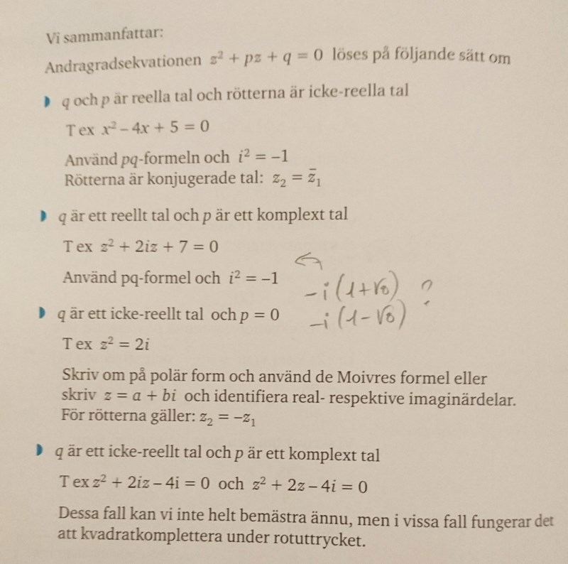 För övrigt kan jag säga att pq-formeln alltid funkar, (för p och q båda komplexa tal) men att det ibland finns genvägar att ta. Det kan bli lite bökigt med att ta roten ur ett komplext tal på rektangulär form.