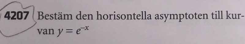 Hej, jag ska bestämma den horisontella asymptoten till denna kurva. Jag började med att skriva om kurvans funktion enligt potenslagarna y = 1/e^x och såg då att den inte har någon horisontell asymptot. Facit tycker ändå att den har det. Men jag fattar inte hur...