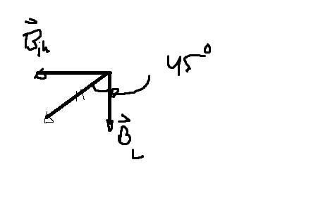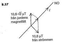 Detta skulle betyda att magnetfältet från ledaren är lika stark som magnetfältet från det horisontella jordmagnetiska. Jag fick vinkeln mellan resulterande magnetfält och magnetfältet från ledaren till 45 grader då nålen vrider sig från nordlig riktning till nordostlig, men detta kanske är ett felaktigt antagande?