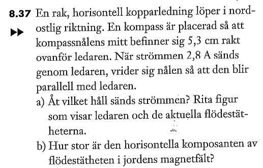 Hej, jag har löst a), men undrar hur jag ska lösa b). Själv har jag ritat ut följande situation för magnetfältet hos kompassen: