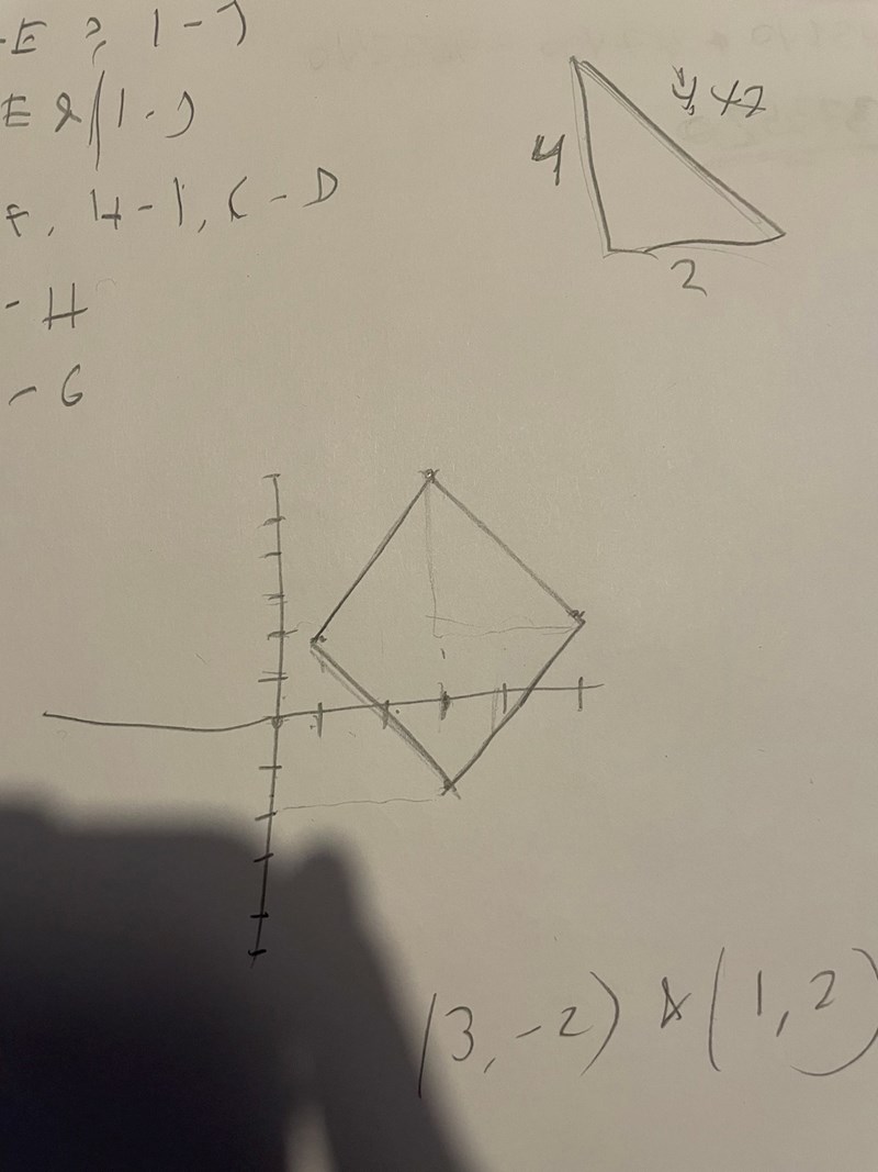 Man vet att mellan diagonalerna måste det vara 90° för att vara en kvadrat. Alltså 90-26.57 = 63.44. sedan räknade jag därifrån fram då att ifrån centrum linjen blir det 1 i X och två I Y.