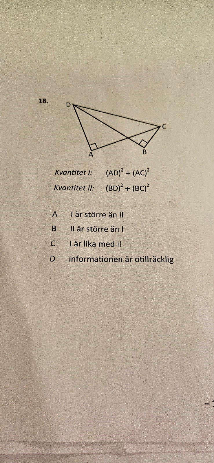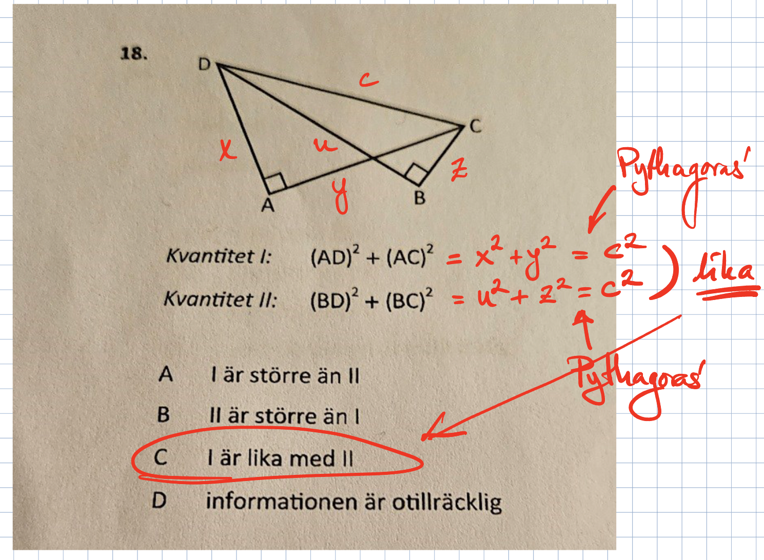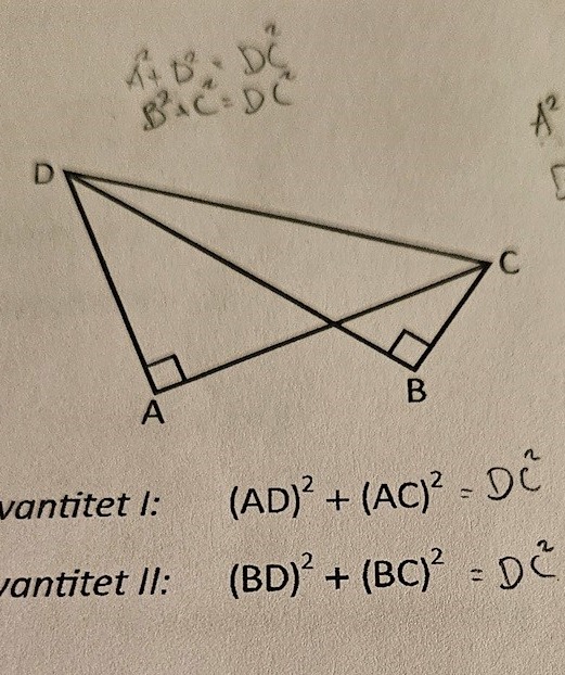 Det finns två rätvinkliga trianglar i figuren. Vad säger Pythagoras sats om sidorna i en rätvinklig triangel? :)