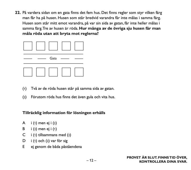 Jag tänker såhär, med information (1) vet vi att 1 av de röda husen finns på andra sidan. Men jag förstår inte om det ska finnas flera röda hus, med tanke på texten som markerades med fet stil. Jag tänkte såhär: