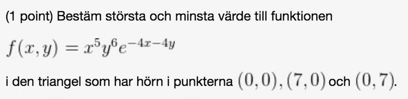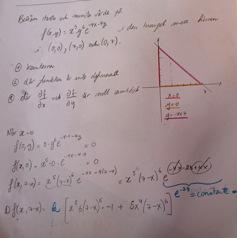Eftersom och gör att båda derivatorna med noll räcker det med att antingen eller är noll. och är således kritiska punkter för alla och . Det som är extra intressant är att dessa sammanfaller med triangelns - och -katetrar (på intervallet som de gäller för), och alltså kan vi strunta i dessa eftersom vi ändå kommer att beräkna största och minsta värde på randen senare.