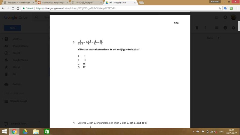 Det går absolut att tänka så, men det tar en tid. Tid du inte kommer att ha på HP. I denna uppgift finns det ett väldigt tydligt mönster. På båda sidor har du två bråk som subtraheras med varandra. Det första bråken i varje led har täljare 4, och de andra bråkens nämnare har värdet 4. Det lättaste och snabbaste är att först kolla om du kan få båda sidor att bli helt identiska. Då måste nämnare i bråk ett i VL samt täljare i bråk två i VL vara likamed deras respektive i HL. Du får alltså att x+1=17, eller x=16. De frågar endast efter ett svar, och 16 är ett alternativ. Alltså är svaret C) 16.