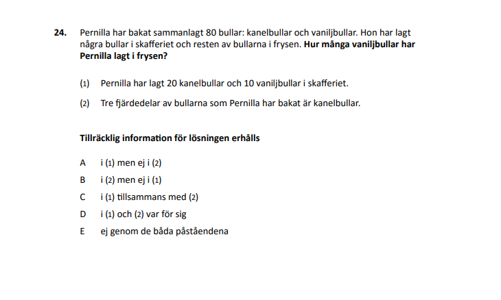 Jag förstår inte riktigt varför rätt svar i facit är A. Förstår jag fel eller är inte implikationen av A, att du får svaret med (1) och att (2) inte tillför någon nytta? Utan någon tilldelad fördelning för vilken typ av bullar, hur är (1) tillräcklig?