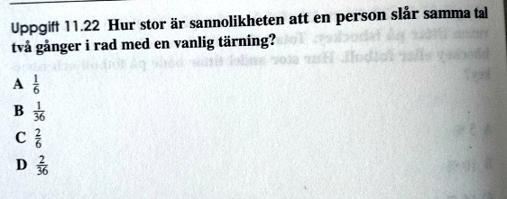 Sannolikheten att personen slår två ettor i rad är 1/36. Sannolikheten att personen slår två tvåor i rad är 1/36, o.s.v.