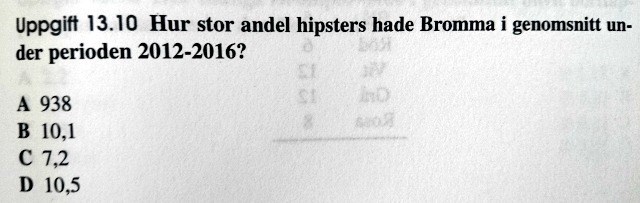 Jag räknade 11.9 + 8.8 + 6.4 + 8.9 + 12.9 = 48.9/5 så mindre än 10% men mycket mer än 7,2%. Faciten säger dock A (som är inga porcent!). Vad vill dom att vi räknar här engentligen?