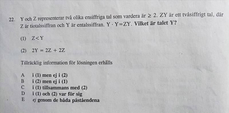 Yngve skrev :Snabbast är nog att pröva sig fram bland de möjliga alternativen. Y skall vara ensiffrigt och större än 1. Det ger följande möjliga alternativ: